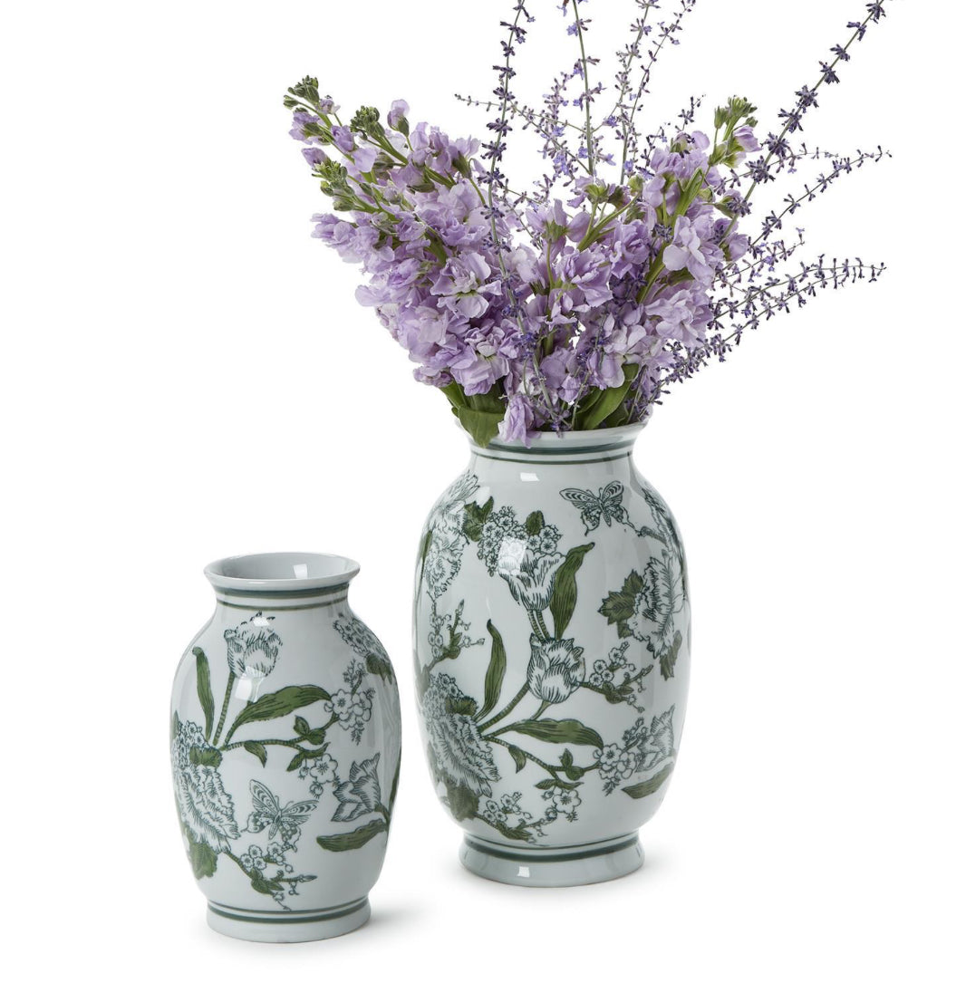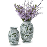 Elevate your living space with the Primrose and Lotus Hand-Painted Chinoiserie Vases. These exquisite, hand-painted vases in green and white porcelain add a touch of elegance and charm to any room. The color variations make each piece unique. Perfect for displaying fresh blooms or on their own, these vases are a timeless addition to your home decor.