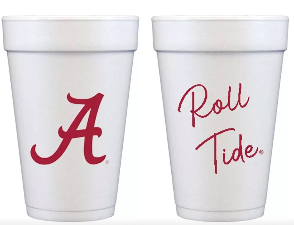 University of Alabama – Roll Tide cups are a cute touch to your University of Alabama celebration. Our 16 ounce foam cup packs are pre-printed with the design shown and are available in 10 count sleeves – a festive gift to take to your Crimson Tide football tailgate or graduation party. This foam cup is our most popular size (16 oz) and can be served across a variety of drinks including beer, mixed drinks or any drink needing ice.