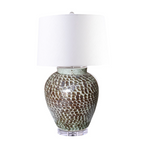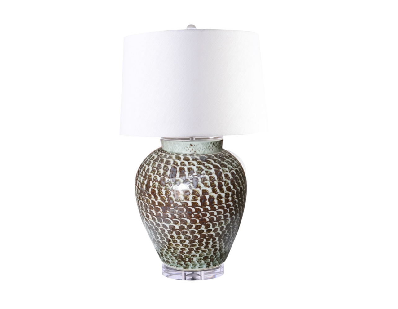 Elevate your home decor with the Rusty Brown Porcelain Jar With Fish Scale Pattern Table Lamp. This exquisite lamp features a unique fish scale pattern on a rustic brown porcelain jar, bringing a touch of elegance and charm to any room. The lamp size of 20 x 20 x 32 inches makes it a standout piece in your space, while the 13 x 13 x 17 inches lamp body adds a visually appealing dimension. Add a touch of sophistication to your living space with this striking table lamp