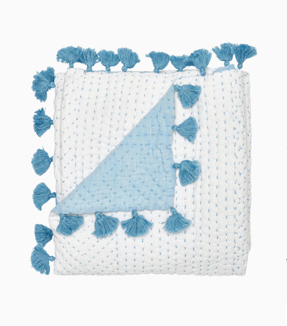 These super fine cotton throws are patiently stitched by hand. Crafted in thin layers of cotton voile, and a contrasting reverse of cotton chambray, only the super fine fabric brushes against your skin, not the stitches themselves. Just for fun we added tassels.