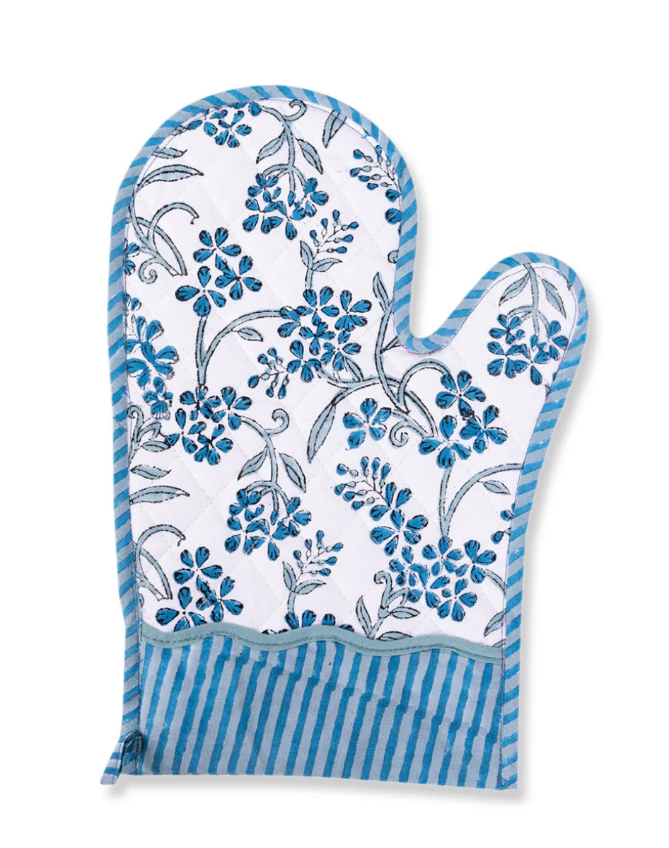 Cooking made chic - this pretty blockprint oven mitt elevates the everyday and adds a colorful charm to your kitchen. Handmade in India, the cheery color combo and the striped trim make a bold statement. By opting for sustainable table linens over disposable, we can help cut down on waste and support an age-old craft by artisans in Jaipur.