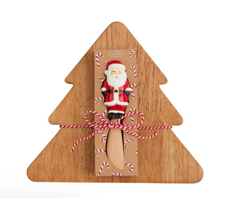 The Santa Tree Board Set is a delightful 2-piece set that is perfect for adding a festive touch to your holiday gatherings. Crafted from high-quality pine wood, the set includes a charming tree-shaped board and a wooden spreader with a ceramic figural handle. The wooden tree-shaped board is not only visually appealing but also functional. It provides a sturdy and spacious surface for serving a variety of snacks, appetizers, or even desserts. Measuring 7 3/4" x 8 3/4", it offers ample space to arrange your favorite treats in an eye-catching display. Accompanying the board is a wooden spreader with a ceramic figural handle. This spreader adds an extra touch of whimsy to your serving experience. The ceramic handle features a delightful Santa Claus design, making it a charming addition to your holiday table. With its compact size, the spreader measures 5" in length, making it easy to handle and perfect for spreading butter, cheese, or any other delectable spreads onto crackers, bread, or other accompaniments. Whether you are hosting a holiday party or simply enjoying a cozy night in with loved ones, the Santa Tree Board Set is a must-have addition to your festive tableware collection. Its unique design and high-quality craftsmanship make it a standout piece that is sure to impress your guests and bring joy to your holiday celebrations.