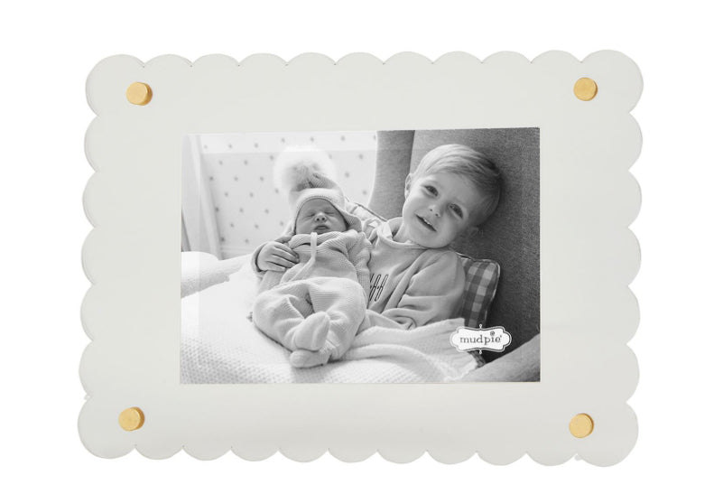 Scalloped acrylic 5" x 7" frame with brass rivet detail. Easel back.