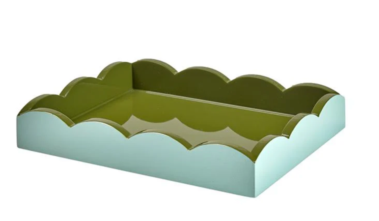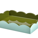 Our 11" x 8" Eau De Nil and Khaki Two-Tone Scalloped Tray is finished with 20 coats of high gloss lacquer, carefully polished by hand between each coat. The blush green interior contrasts beautifully with the rich blue exterior, making it a chic and versatile piece.