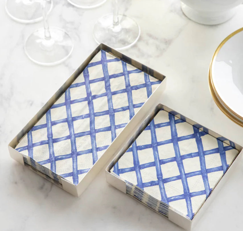 This silver-plate napkin holder is handmade and designed to bring a touch of sophistication and class to any occasion. Its timeless finish makes it a perfect addition to any room, whether hosting a formal gathering or an intimate party. Its elegant design adds a touch of luxury to any cocktail napkin or guest napkin.Available in guest and cocktail napkin sizes.