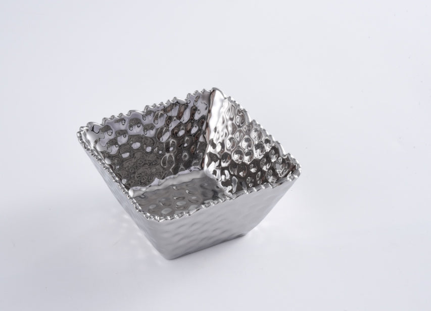 Square Snack Bowl in Millennium. Great for individual snacking, dips or for toppings for a make your own taco, sundae, or pizza night! A perfect addition to any bar for lemons and limes. Striking and elegant silver titanium finished high-fired porcelain. Food safe, tarnish free, dishwasher safe, oven safe to 500°. Tarnish and stain-free. Easy Care.