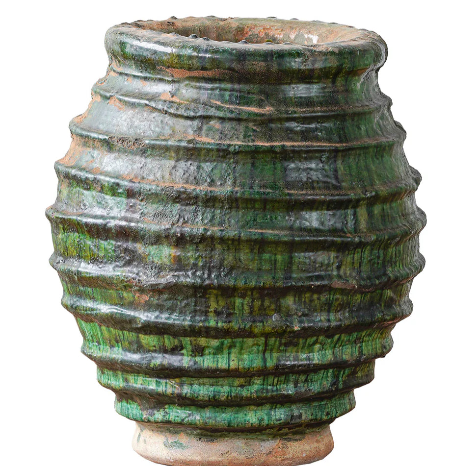 These Ribbed Oil Jars are a striking group of complementary hand-shaped clay pots crafted for decorative use. Each pot features ringed ridges that are roughly equidistant apart from the top to the bottom of the oval-shaped jars. The Ribbed Oil Jars have a wide mouth with a gently ridged lip. They are finished in hues and sizes that easily mix-and-match to create an eclectic, artisan assemblage in an indoor or outdoor space.
