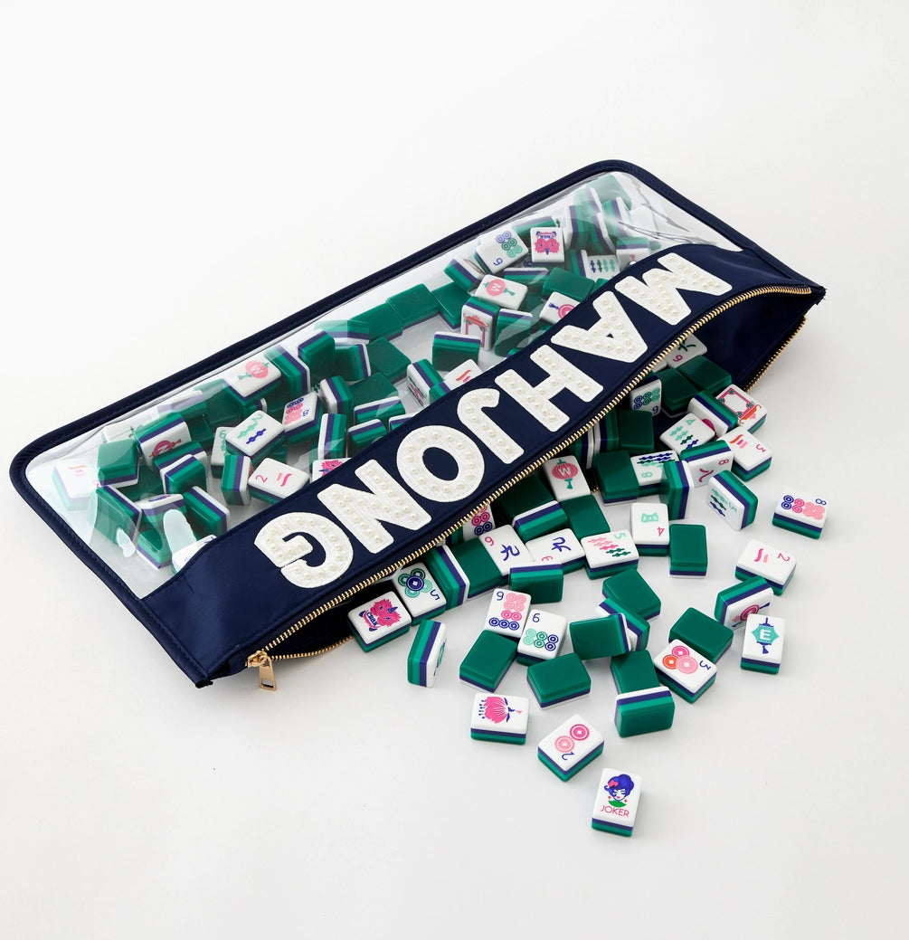 Well, bless your heart, darlin'! If you're lookin' for a little Southern charm to add to your mahjong game night, this Navy Vinyl bag with a zipper and MAHJONG printed in pearls is just the thing you need. With its convenient zipper closure and clear bottom section, this bag is as practical as it is fashionable. Show off your coveted tiles to your envious opponents with ease. Dimensions: 21”x 9” Holds a full set of tiles