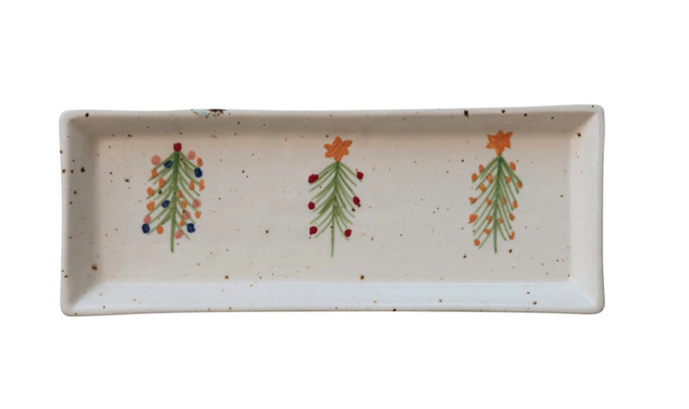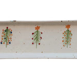 12"L x 4-1/2"W Hand-Painted Stoneware Platter w/ Christmas Trees, Multi Color Speckled