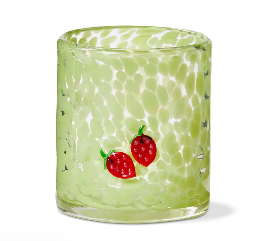 Indulge in your favorite cocktail with a touch of whimsy in the strawberry confetti double old fashioned glass. this handcrafted masterpiece features vibrant confetti patterns within clear glass, accented by a charming, hand-applied strawberry icon.