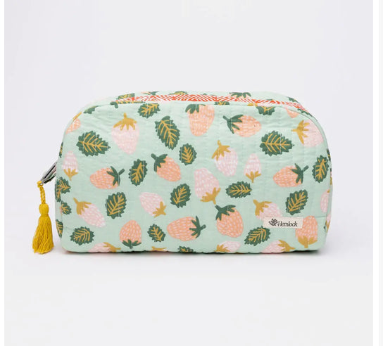 Color & Pattern: Pale green with pink and red strawberries Material: 100% premium cotton outer, vinyl water resistant liner inner.