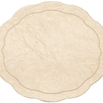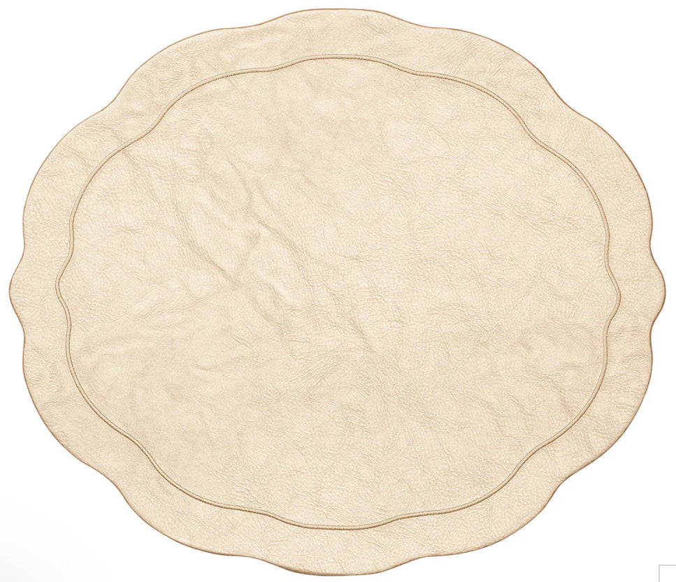 The traditional oval shape gets a modern refresh with the matte faux leather gold Tailored Placemat. A stylish wavy edge and embroidered tone-on-tone border detailing elevate this faux leather accessory. This hard-backed, versatile placemat is available in a variety of colors. The subtle gold variation is suitable for various entertaining themes, whether it's a beach chic party, grand gala, or everything in between. This versatile placemat effortlessly adapts to both dressed-up and more laid-back settings.