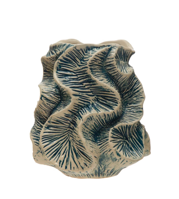 This blue and ivory stoneware vase with a wavy pattern is a stunning piece of décor that will enhance the look and feel of the home. The vase has a blue and ivory color scheme that is soothing and refreshing, creating a contrast with the wavy pattern. The wavy pattern creates a textured and dynamic effect on the surface, giving the vase a unique and attractive appearance. The vase has an organic shape that mimics the curves and contours of nature, creating a harmonious and elegant effect. The vase has a smooth and glossy surface that reflects light and adds some shine to the space. The vase is made of stoneware, a type of ceramic that is strong and long-lasting. The stoneware is also easy to clean, simply wipe it with a damp cloth or wash it with mild soap and water. The vase measures 6.75 inches in diameter and 7.5 inches in height, making it suitable for holding a variety of flowers, plants, or other decorative items. Whether place it on a table, a shelf, or a windowsill, this blue and ivory stoneware vase with wavy pattern will add some charm and beauty to the coastal, bohemian, or modern style home. A beautiful vase with a blue and ivory color scheme and a wavy pattern that creates a dynamic and eye-catching effect. This vase would be a great addition to any bohemian, coastal, or eclectic home décor. The vase is a perfect way to display a variety of flowers, plants, or other decorative items making it a versatile piece that can be used in any room of the home. Made of stoneware.