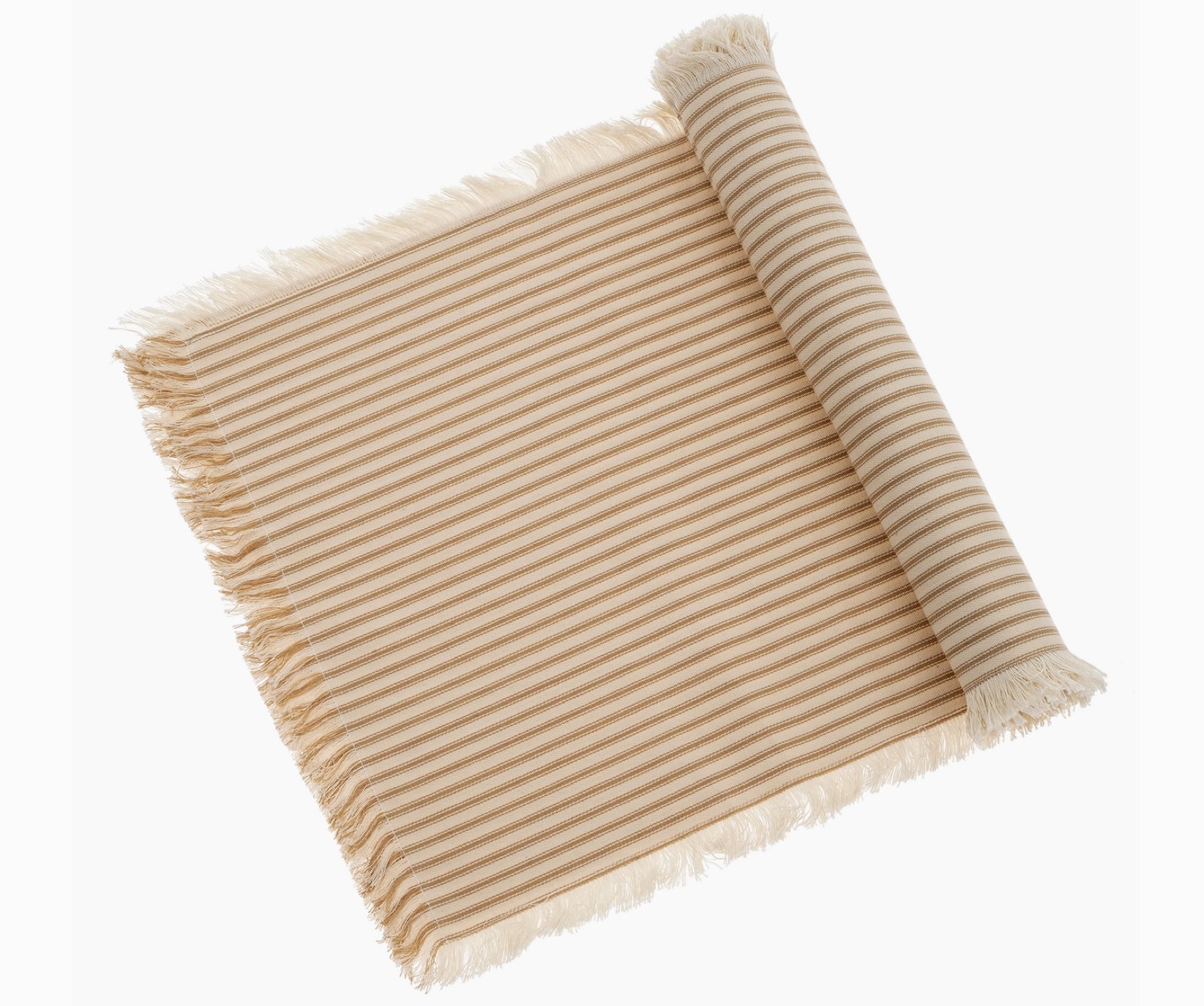 Bring texture, pattern, and interest to your table by layering on an easy to style Ticking Fringe Runner. With woven stripes and embellished with an eyelash fringe, this tried-and-true French classic has stood the test of time. Add a runner to create a welcoming table for day-to-day use or dress it up with a more is more approach for dinner parties with thoughtful layers of texture and style. Machine Washable.