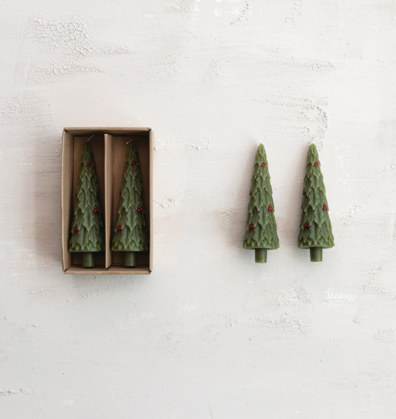 8"H Unscented Tree Shaped Taper Candles in Box w/ Holly, Green & Red, Set of 2 (Est. Burn Time 20 Hours)