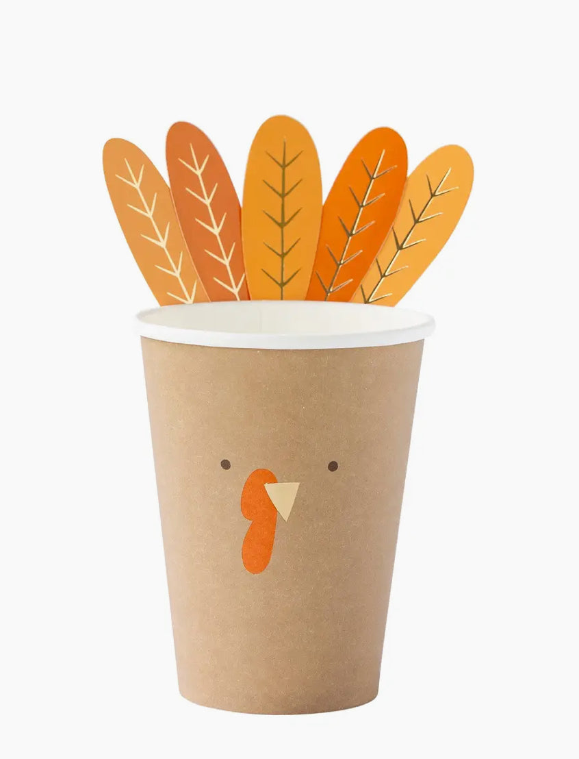 Add a playful touch to your harvest table with our Turkey Paper Cup! Featuring a charming turkey design with adhesive feathers, these cups are perfect for serving your Thanksgiving guests. Bring some festivity and fun to your holiday gathering with these unique paper cups. • 8 cups per package • 12 oz cups • kraft and gold foil accents • includes 7 double-sided feathers with adhesive