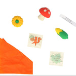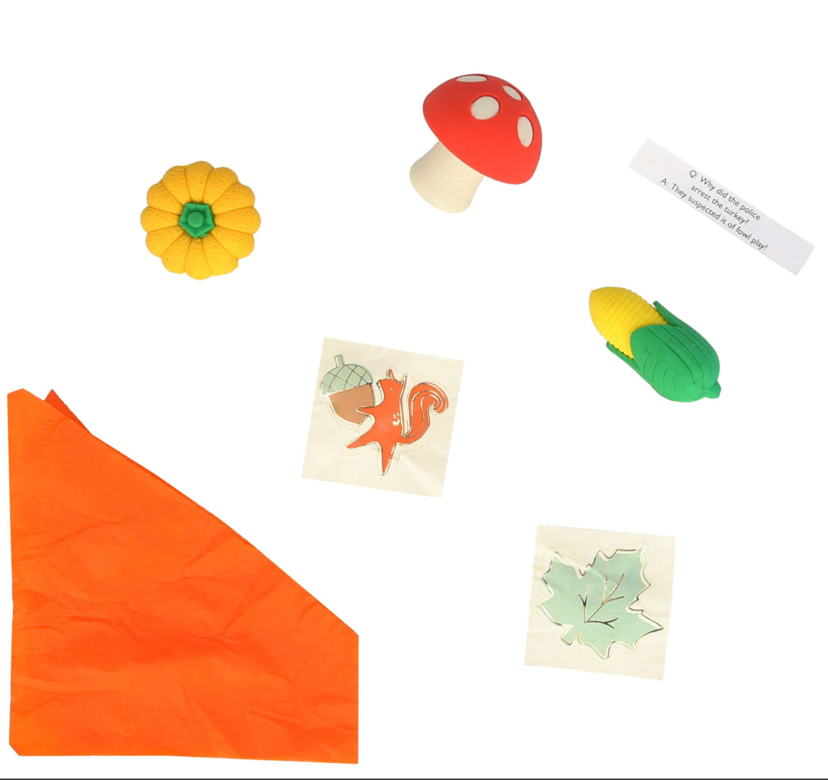 - The erasers are in the shape of a toadstool, a pumpkin and sweetcorn