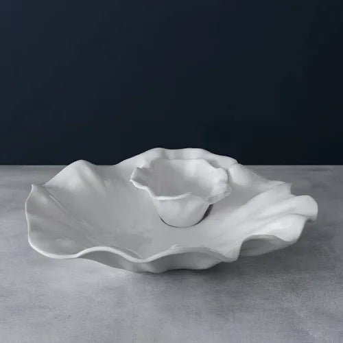 Beauty in full Bloom. Designers Beatriz Ball and Gretchen Murchison share a desire to create pieces that are beautiful as well as functional. That's why we've collaborated with the like-minded Louisiana-based ceramicist on the vibrant Bloom Collection. Rendered in the company’s signature sand-cast metal, in luxury melamine, and in acrylic, the Bloom Collection comprises sculptural bowls, platters and more inspired by floral and botanical forms. As with the other Bloom pieces, the dynamic design of the two-part VIDA Bloom Chip and Dip in luxury melamine features rippling petal-like movement, creating an eye-catching serving piece that combines beauty, artistry and functionality. Great on its own, or combined with other Bloom shapes and sizes, this handsome chip and dip will be the life of the party. Presented in a glistening white melamine with the look of ceramics. The dip bowl is detachable, and may be used on its own. Dishwasher safe (top rack), heavy-weight, break resistant and durable, food safe, BPA and PABA free.