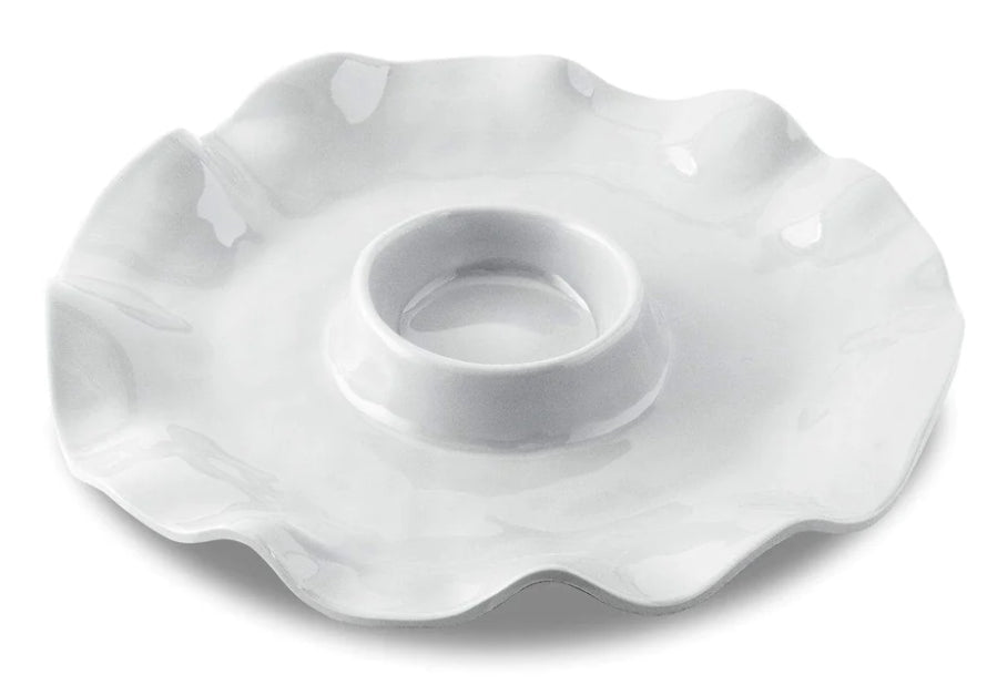 Beatriz Ball's Havana White Chip & Dip is equipped with a generous area for chips (or veggies) surrounding a built-in dip bowl. Weight, and appearance of a ceramic but is made of luxury melamine for everyday enjoyment. It makes an artistically stylish display. Works with any décor, indoors and out.