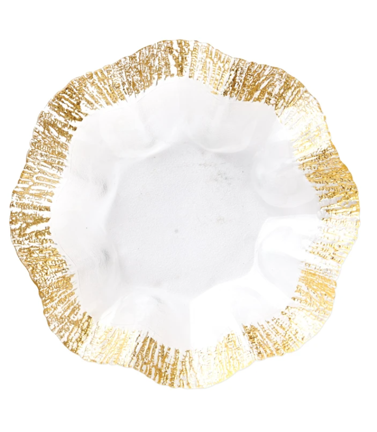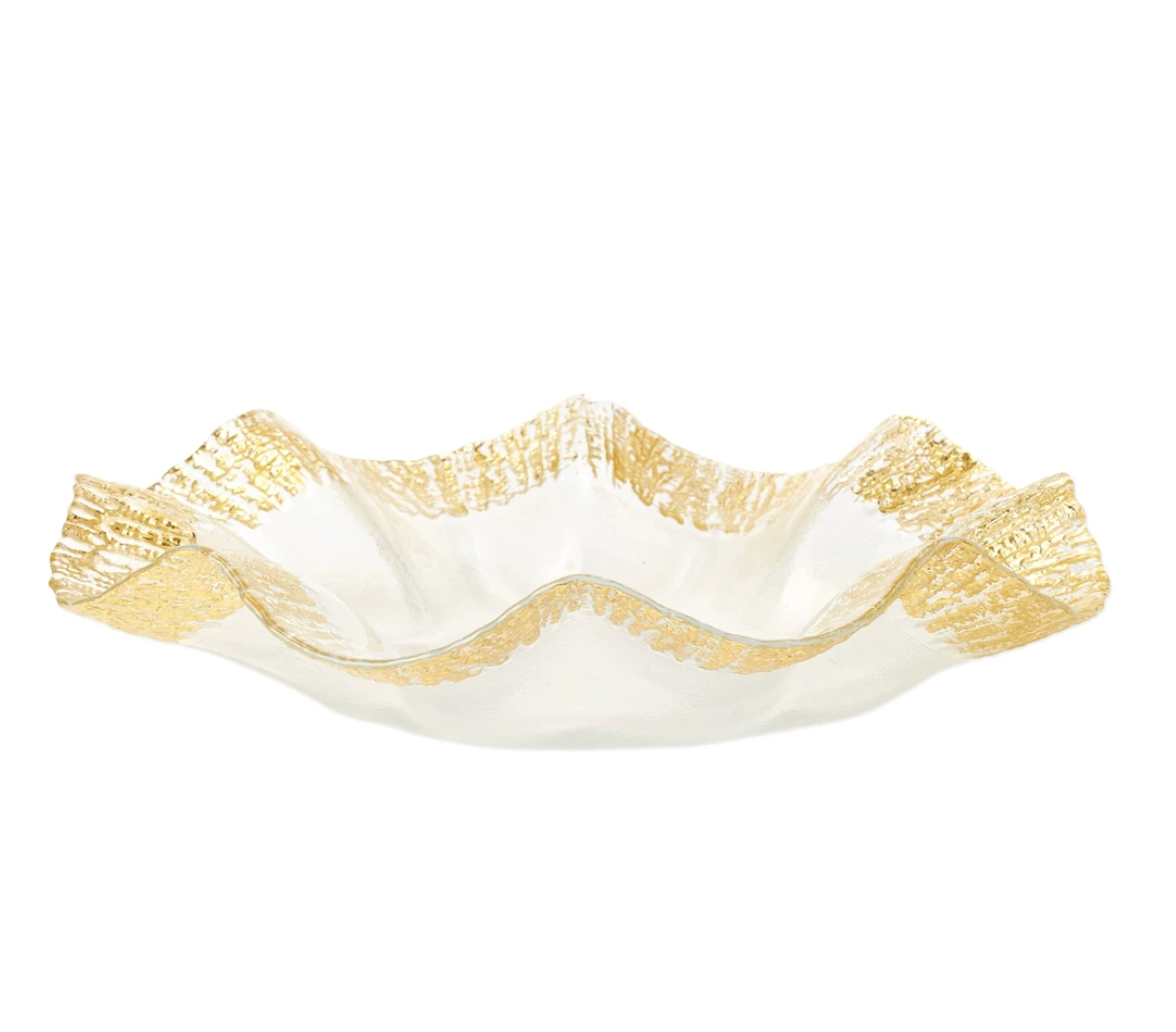 This platter features golden strands on the border of the elegantly ruffled platter. The embellishment is effortlessly beautiful.
