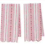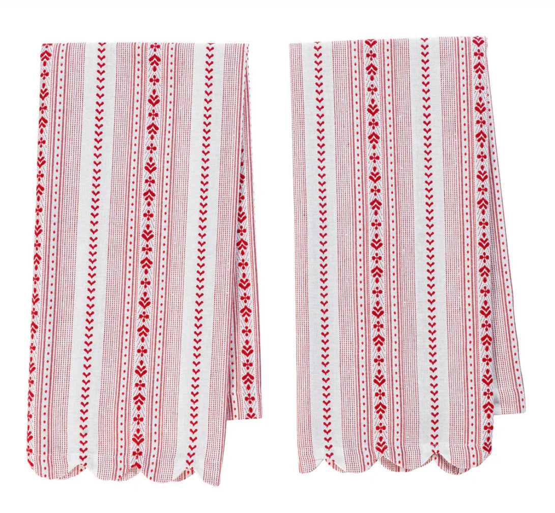 Our favorite motif from the Villa Sevilla pattern is transformed into a jacquard stripe in red and cream, tailored with a sweetly scalloped edge. This set of two kitchen towels brings an irresistibly cheerful, charming and traditional feel to the kitchen, creating a cohesive look to coordinate with table settings and makes a wonderful hostess gift.