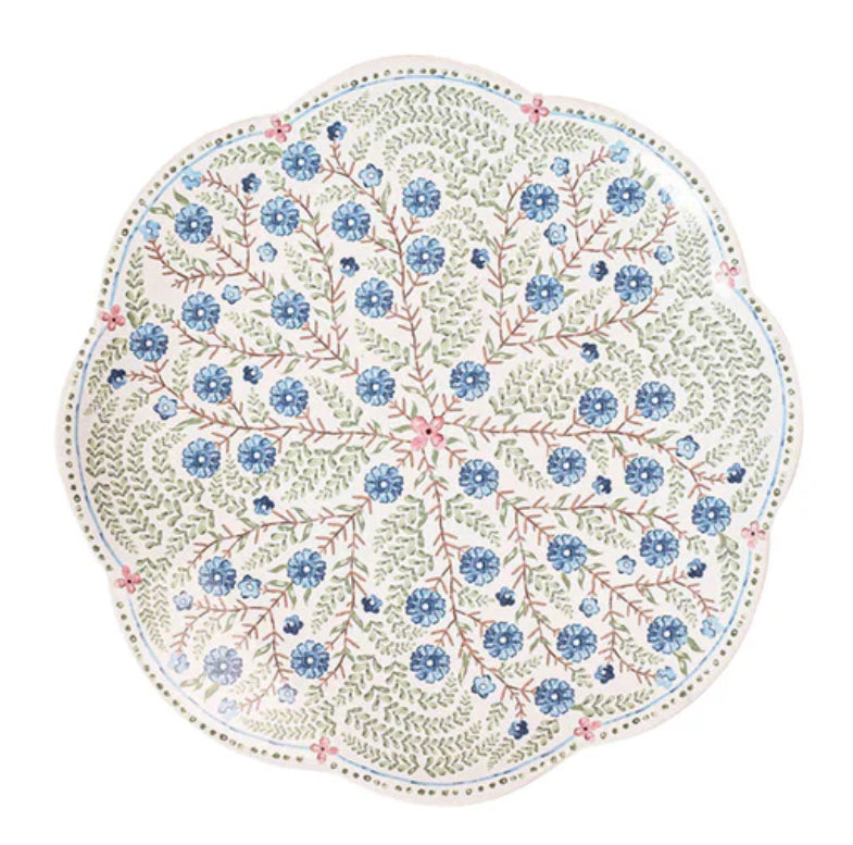 Festooned with a burst of intricate leaves, charming blue flowers and a scalloped rim with tiny dots and pink blossoms, this enchanting plate makes serving up salads and sweets a delicious work of art.