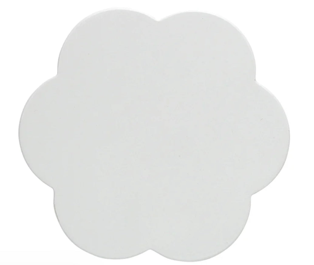 Large white scallop placemats finished with 20 coats of high gloss lacquer, hand polished between each coat. The base is finished with cream velvet embossed with our logo.