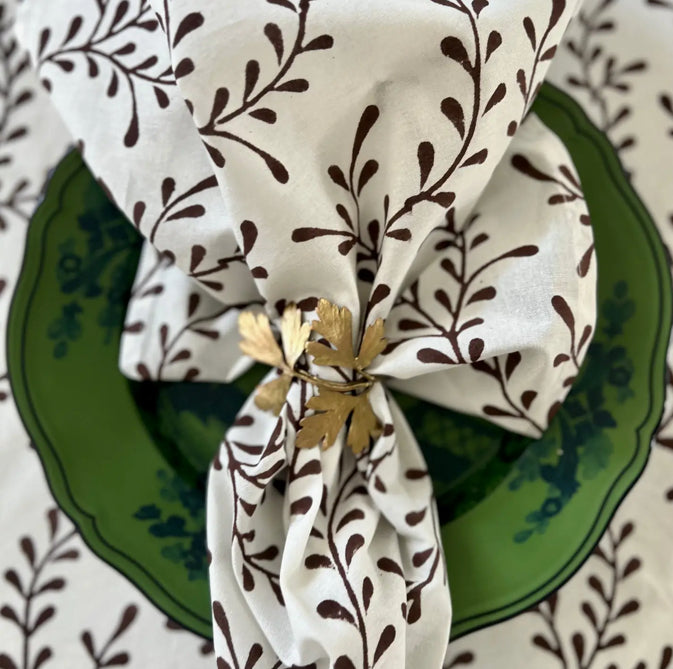 Dinner Napkins Block print by artisans in India 100% cotton 22” x 22” Please note that slight variation may occur due to the handpainted and blockprint style of printing. Care instructions: Hand wash recommended If machine wash, wash cold, separately, gentle cycle