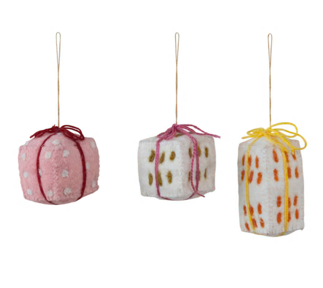 2 1/4”H - 4”H Handmade would felt gift shaped ornaments. Available in three styles.