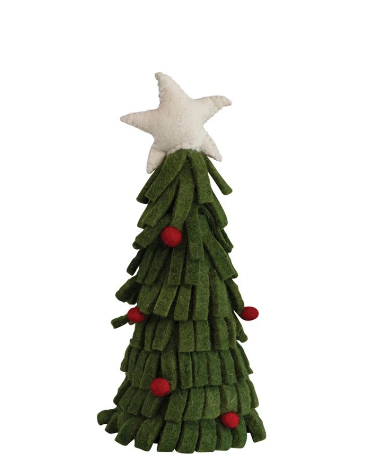 This handmade wool felt tree with star and pom poms in multicolor is a playful and festive decoration that brings cheer to any room. Add a touch of magic to holiday displays with our stunning collection of figures and figurines, including an array of festive silhouettes, perfect for celebrating the season in style.