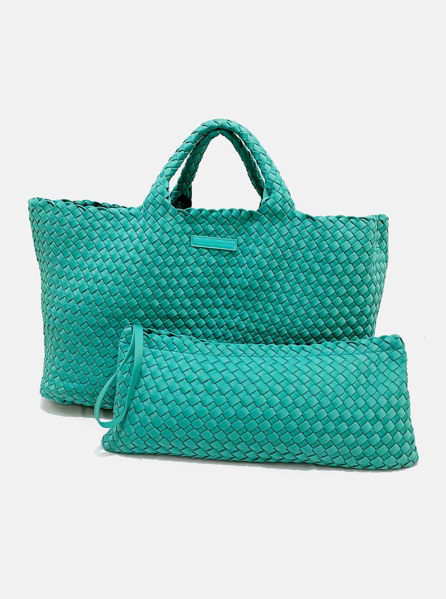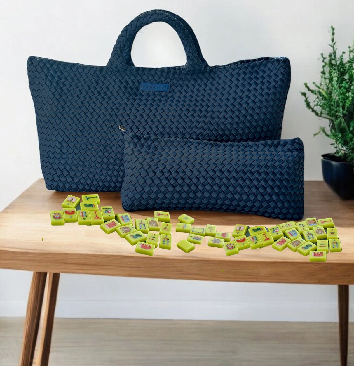 The large Woven Mahjong Carryall has it all. Featuring a convenient, removable matching pouch for your tiles, this dreamy bag is spacious enough to keep you organized, on trend and ready for the next game. Designed to carry all your mahjong necessities, it holds your tiles, racks, mat and cards. Made from durable woven neoprene this bag is easy to clean and comes with a detachable crossbody strap.