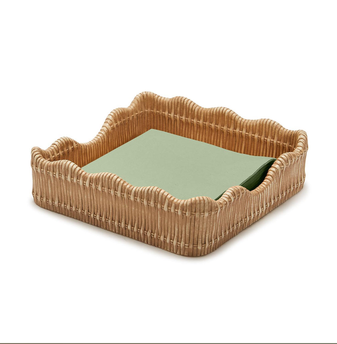 Keep napkins neat and orderly with this wicker weave pattern resin napkin holder. Carved scalloped edge adds the perfect detail to this decorative napkin holder.